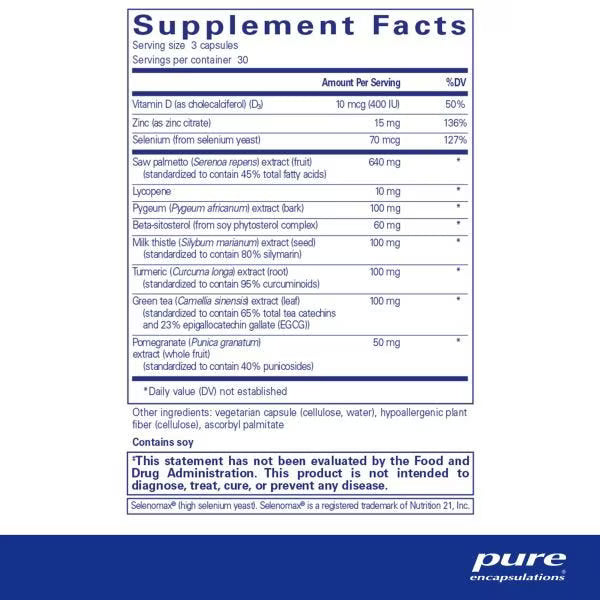 - Cellular protection — Includes lycopene, selenium, zinc, vitamin D₃, curcumin, green tea, pomegranate, and silymarin to support prostate cell cycle integrity and antioxidant defenses.